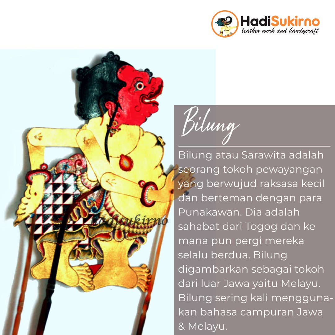 Bilung atau Sarawita adalah seorang tokoh pewayangan yang berwujud raksasa kecil dan berteman dengan para Punakawan. Dia adalah sahabat dari Togog dan ke mana pun pergi mereka selalu berdua. Bilung digambarkan sebagai tokoh dari luar Jawa yaitu Melayu. Bilung sering kali menggunakan bahasa campuran Jawa & Melayu. Setiap........... Tanggal Posting : Kamis, 22 Oktober 2020 Pengirim : admin |