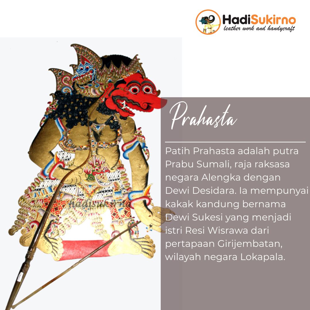 ![]() | Prahasta merupakan putra Prabu Sumali di negara Selagaringging, ia memiliki saudara yang bernama dewi Sukesi yang kemudian menjadi ibu dari dasamuka. Setelah Dasamuka menjadi raja di Alengka Prahasta diangkat sebagai patih. Prahasta berpenampilan galak, bermata dua dengan bentuk plenglengan, berhitung pelokan, bermulut ngablak dengan kumis, jenggot dan jambang yang lebat. Ia bermahkota pogag, dengan hiasan........... Tanggal Posting : Rabu, 21 Oktober 2020 Pengirim : admin |