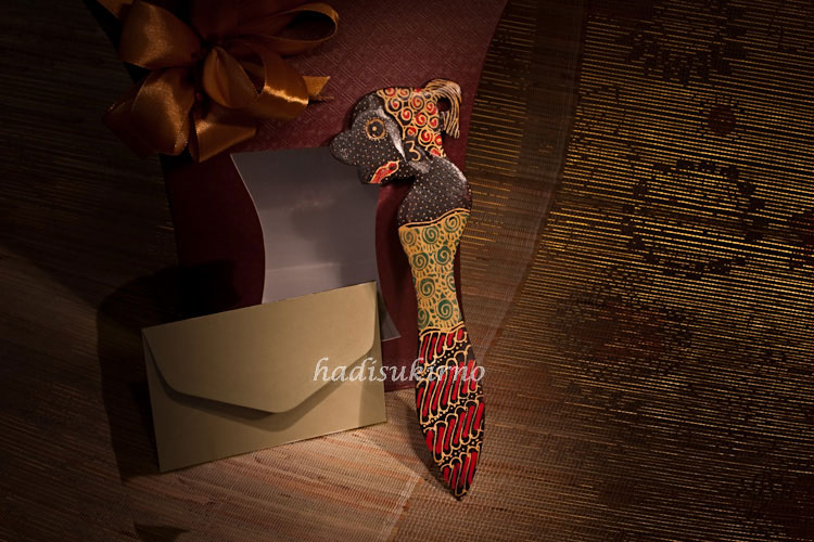 Wayang dan batik adalah warisan seni budaya Indonesia yang masih tetap terjaga hingga saat ini. Souvenir pembuka surat dengan motif batik ini cocok untuk dijadikan souvenir pada acara pernikahan yang bertemakan adat tradisional.