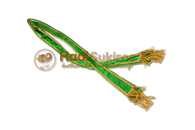 Sebe TrijataRp. 270.000 Sebe merupakan salah satu aksesoris yang digunakan pada peraga tari wayang orang. Salah satunya sebe digunakan pada peraga wayang Orang Trijata. Sebe wayang Trijata berwarna hijau, dibuat dari bahan beludru dengan hiasan plisir emas pada kedua sisinya dan hiasan gombyok pada kedua ujungnya. Panjang sebe sekitar 140 cm, sedangkan untuk lebarnya adalah sekitar 7 cm. Sebe digunakan dengan cara diselempangkan pada bagian bahu dan badan.