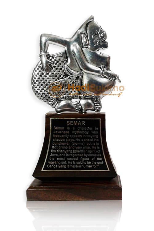 Semar Klithik LogamRp. 110.000 Wayang Klithik Semar ini cocok untuk dijadikan souvenir event perusahaan. Wayang Klithik Semar ini dibuat dari bahan logam dan kayu, dilengkapi dengan penjelasan karakter tokoh wayang dalam Bahasa Indonesia atau Bahasa Inggris. Wayang Klithik Logam atau miniatur wayang ini selain unik, elegan juga bernilai seni dan budaya, bisa menjadi media untuk lebih mengenalkan seni dan budaya Indonesia. Material : Logam dan Kayu Ukuran : + 15 cm Semar adalah pemimpin para Punakawan. Dalam pementasan wayang, Semar adalah tokoh yang menjadi pengasuh dan pamong para ksatria yang berbudi luhur. Bentuk fisik Semar seolah-seolah menggambarkan jagad raya. Tubuhnya bulat, menggambarkan bumi tempat tinggal manusia dan makhluk hidup lainnya. Semar tersenyum, tapi matanya sembab, ini menjadi simbol suka dan duka. Wajah Semar tua namun potongan rambutnya kuncung dan bagian depannya berwarna putih, ini sebagai simbol tua dan muda. Ia berkelamin laki-laki tapi memiliki payudara, sebagai simbol pria dan wanita. Semar penjelmaan dewa tetapi hidup sebagai rakyat jelata, merupakan simbol atasan dan bawahan. |